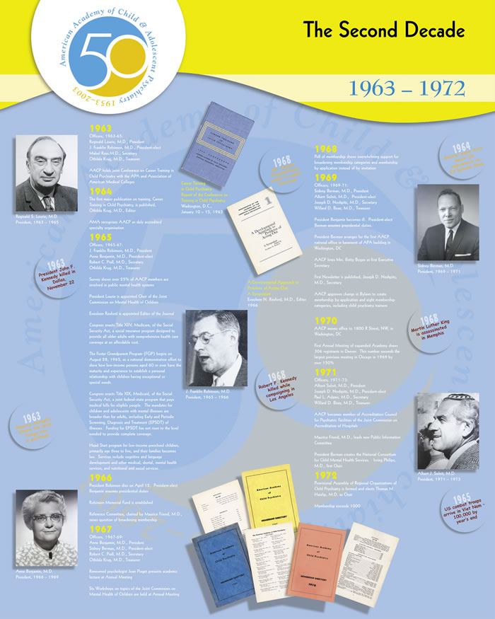 In medicine and mental health we find the introduction of the Community Mental Health Act and child guidance clinics and become affiliated with universities, departments and academic discipline. The AACP established its own Journal in 1961 and for the first time the discipline has a voice that was specifically its own. Neonatology makes its appearance in 1960. Skinnerian psychology/apparent conditioning is introduced to the treatment of autistic children. In 1962, Kempe published the first report in the medical literature of “the battered child”. Bizarrely the Community Mental Health Center Act included “All the people of the Country” but made no specific mandate for children (despite its emphasis on prevention). In the 1960’s, the University of Mississippi, Alabama, and Georgia was forced to integrate which the help of the Federal Government Julius Richmond, an outstanding Pediatrician, introduced a plan that became Project Head Start which he headed in 1965. The first Joint Commission on the Mental Health for Children was legislated by Congress in 1965. Dr. Reginald Lourie one of the nation’s leading Child Psychiatrist a past President of AACP, and Director of Child Psychiatry at Children’s Hospital (D.C.) was asked to organize it. It aligned the nation’s energies toward the mental health needs of the child.