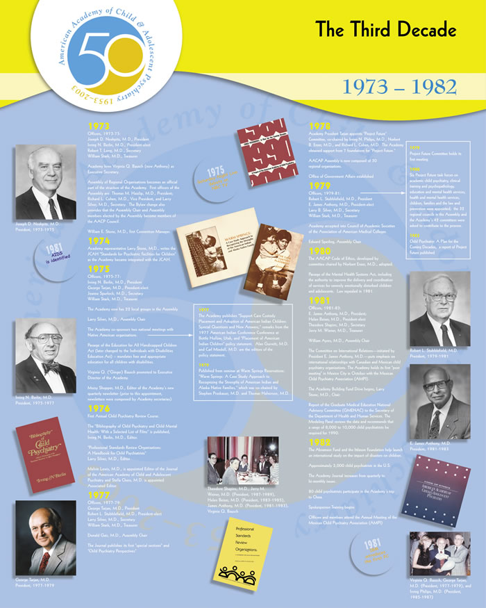 Early in the decade Larry Stone wrote the Standards for Pediatric Facilities for Children as AACP integrates with JCAH. In 1978, AACP was accepted into the Council of Academic Societies of the American Association of Mental Colleges.