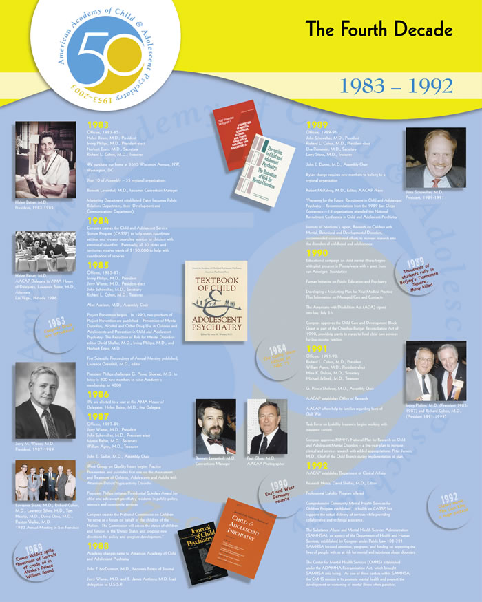 AACP started a building fund in 1981 and purchased its present residence at 3615 Wisconsin Avenue, in Washington D.C. In 1983. The Journal went from a quarterly to a bi-monthly publication. Helen Beiser led the AACP to be elected to a seat in the AMA House of Delegates in 1986. Pressures led to a change in the name of the Academy to include Adolescence in our title and so we became AACAP in 1988. The decade of the 80's found the birth of the Work Group on Quality Issues and the Practice Parameters which resulted.