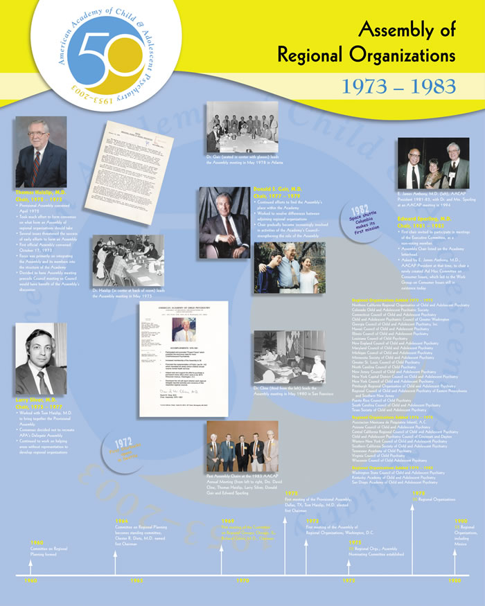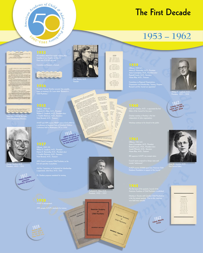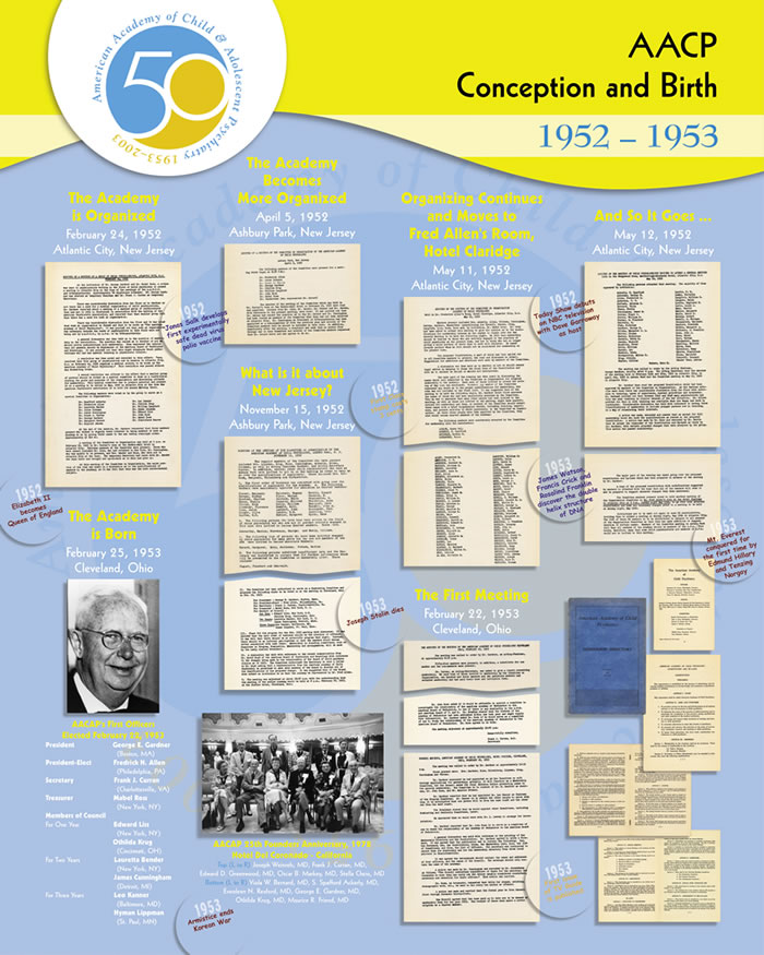In 1951, in Cincinnati, a group of child psychiatrists led by George Gardner got together at an Ortho meeting to consider the desirability of forming and American Academy of Child Psychiatry.” After several organizational meeting, The Academy became a reality on February 22, 1953 in Cleveland, Ohio. George Gardner was elected President and Frank Curran, Secretary/Treasurer. “The history of the discipline has since been intimately interwoven with the story of this organization.”